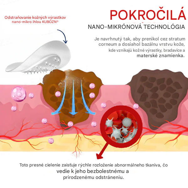 Pomocou technológie penetrácie nanomikroihličkami KUBOZN® uvoľňuje liečivé aktívne zložky priamo pod povrch pokožky a zameriava sa na abnormálne výrastky. Táto bezbolestná a neinvazívna metóda účinne vysušuje, redukuje a odstraňuje kožné výrastky, bradavice a materské znamienka a zároveň podporuje prirodzenú obnovu pokožky. Dramatické výsledky už za pár dní: získajte späť hladkú, prirodzenú pokožku bez jaziev alebo podráždenia.