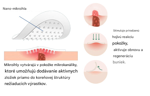 Na rozdiel od tradičných ošetrení, ktoré pôsobia iba na povrch pokožky, nano-mikroihličkové náplasti na odstraňovanie kožných lézií stimulujú prirodzený proces hojenia pokožky, aktivujú obnovu a regeneráciu buniek. To podporuje zdravú obnovu pokožky a zároveň zabraňuje zjazveniu alebo podráždeniu. Výsledkom je hladká a nedokonalá pleť rýchlo, efektívne a úplne neinvazívne.